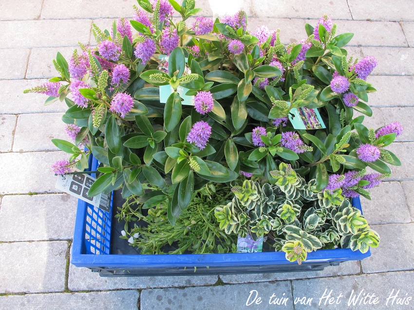Het was me al eerder opgevallen dat de border wat body miste. Er zijn wel de grassen (Miscanthus sinensis 'Morning Light') en de Clematisklimsteunen (de arme Clematissen ziet er niet uit, de droogte heeft hen echt geen goed gedaan, hopelijk herkomen ze volgend voorjaar), maar dat is niet genoeg in verhouding met de kruidachtige beplanting. Dus hier komen de Hebe's in het verhaal.